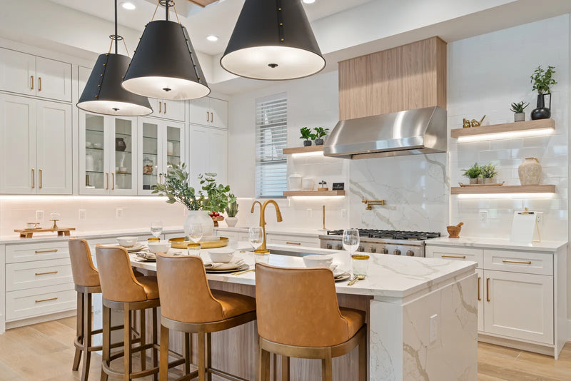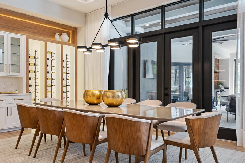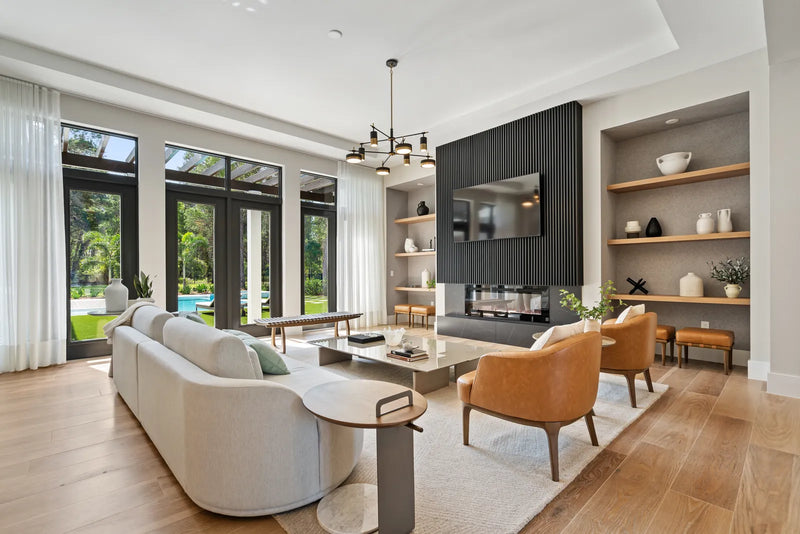 more monumental spaces, while wood, leather, and organic forms add warmth