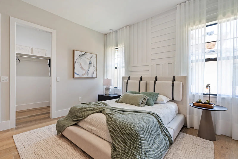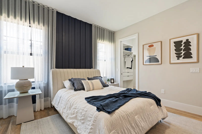 to contemporary areas. In the bedroom, enveloping volumes and deeper